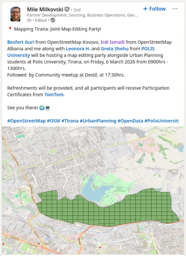 Mile Milkovski nga TomTom, së bashku me Besfort Guri nga OpenStreetMap Kosova dhe unë nga OpenStreetMap Shqipëri, do të jemi në Tiranë për një editing party me studentët e Planifikimit Urban në Universitetin Polis gjatë ditës.